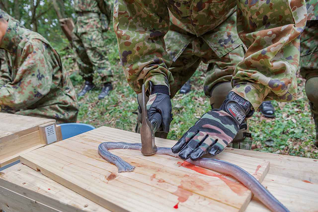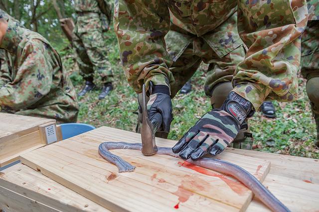 頭を落としたヘビの皮を剥ぐ幹部レンジャー学生。歯で背骨の先端部分をかんで押さえ、手で皮を引っ張る