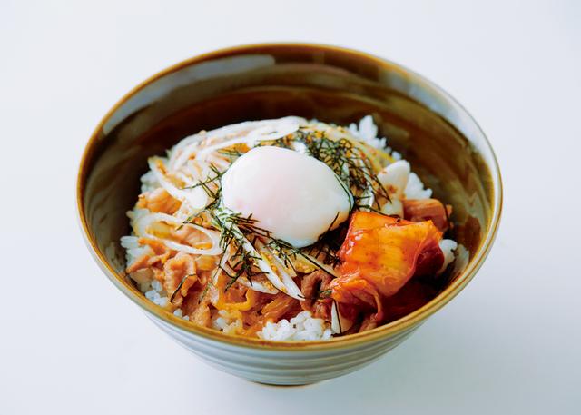 4:器にご飯を盛り、上に(2)と(3)をのせる。好みで温泉卵、刻みのり、白菜キムチをトッピングする。