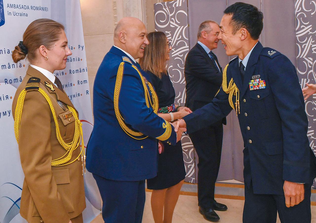 2024年10月に開かれたレセプションにおいて、ルーマニア武官と握手をする笛田1佐(右)。行事に参加する際も退避先と経路の事前確認は怠らない