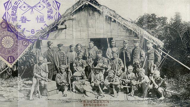 日本初の駐在武官が清に派遣される前年の、1874年台湾出兵時の写真。指揮をとった陸軍中将の西郷従道(中央のいすに座っている)とその幕僚および現地住民