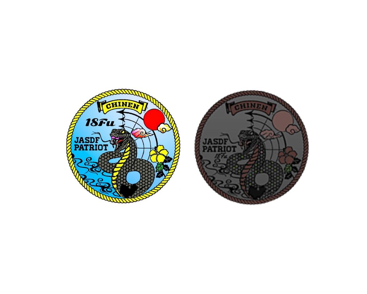 第18高射隊(空自)のロゴマーク。右はワッペンとして作業服に着用する際のデザイン。作業服の迷彩色と色のトーンを合わせた色調になっている